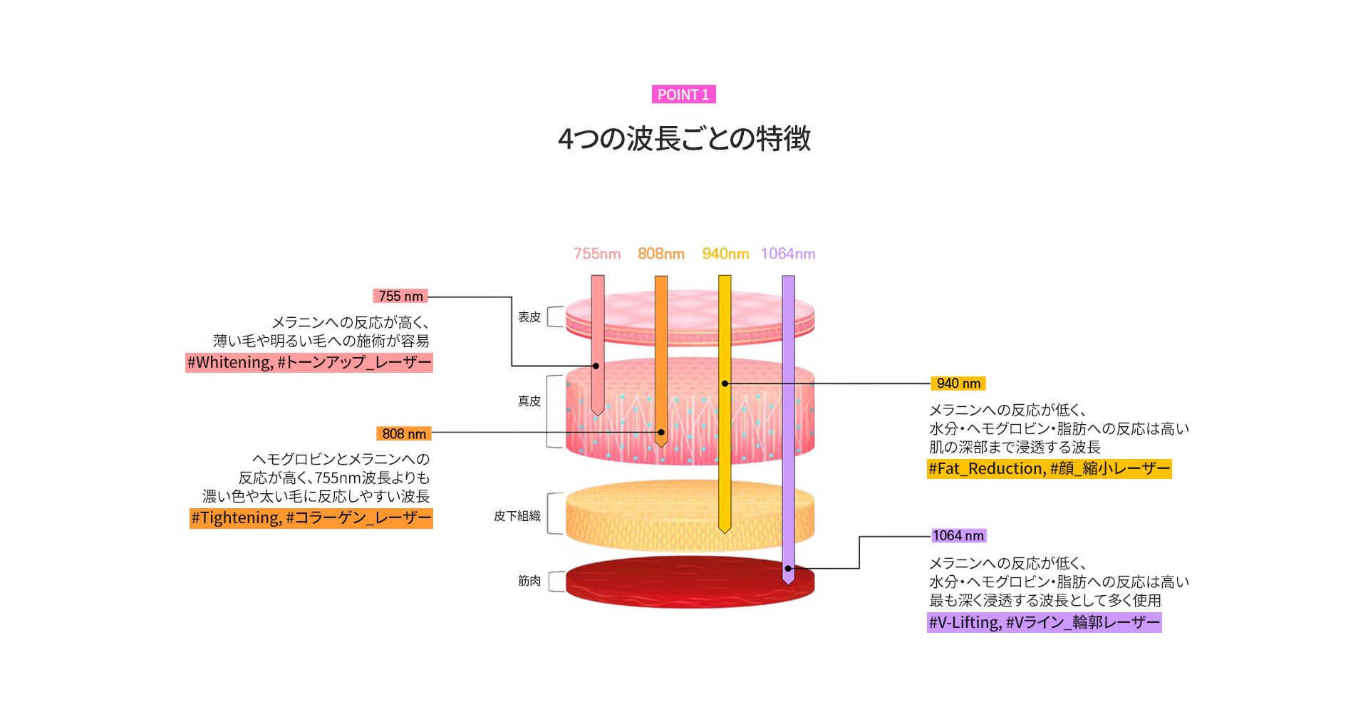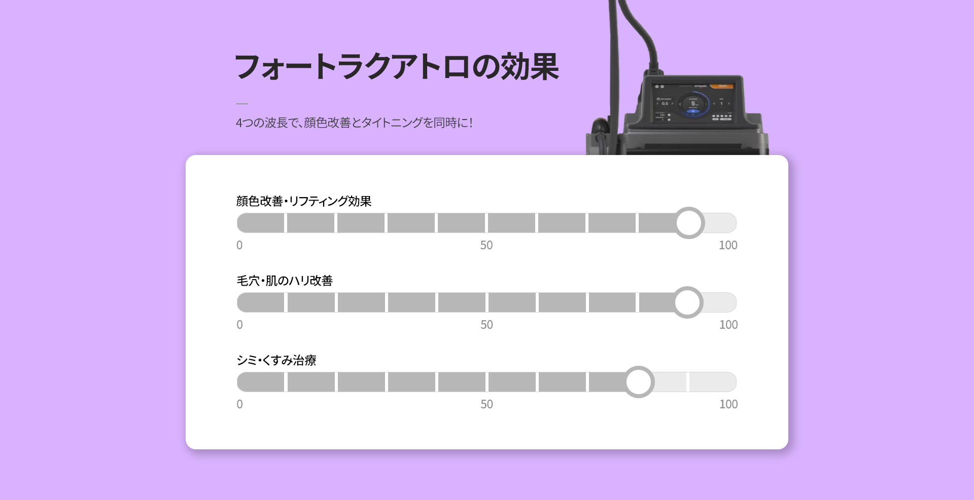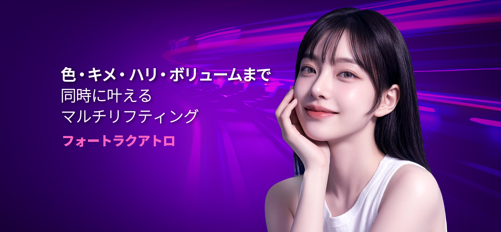 フォートラクアトロは、4つの波長のシナジー効果でコラーゲン再生を促し、肌のハリ強化とリフティングに効果が期待できます。