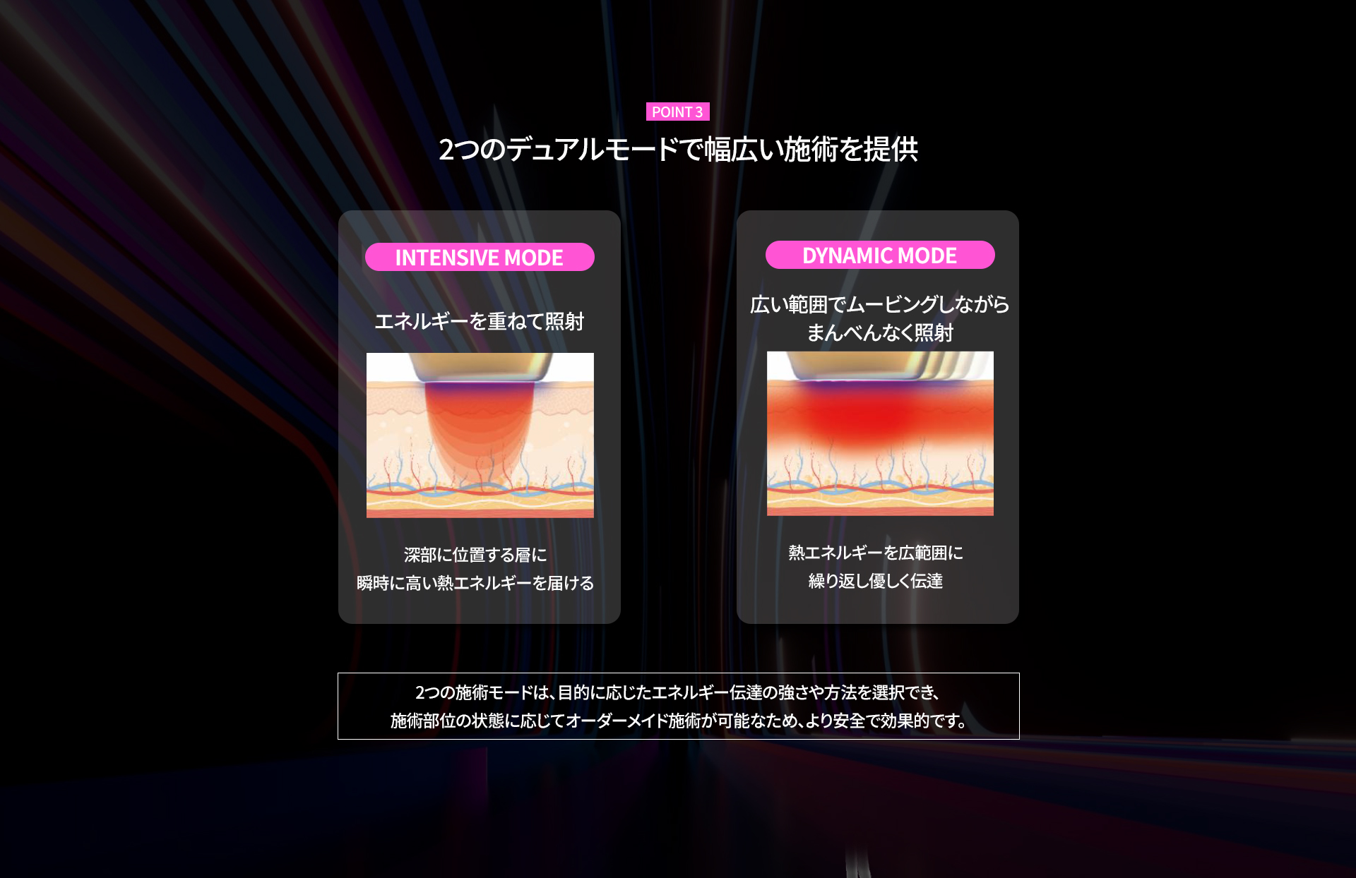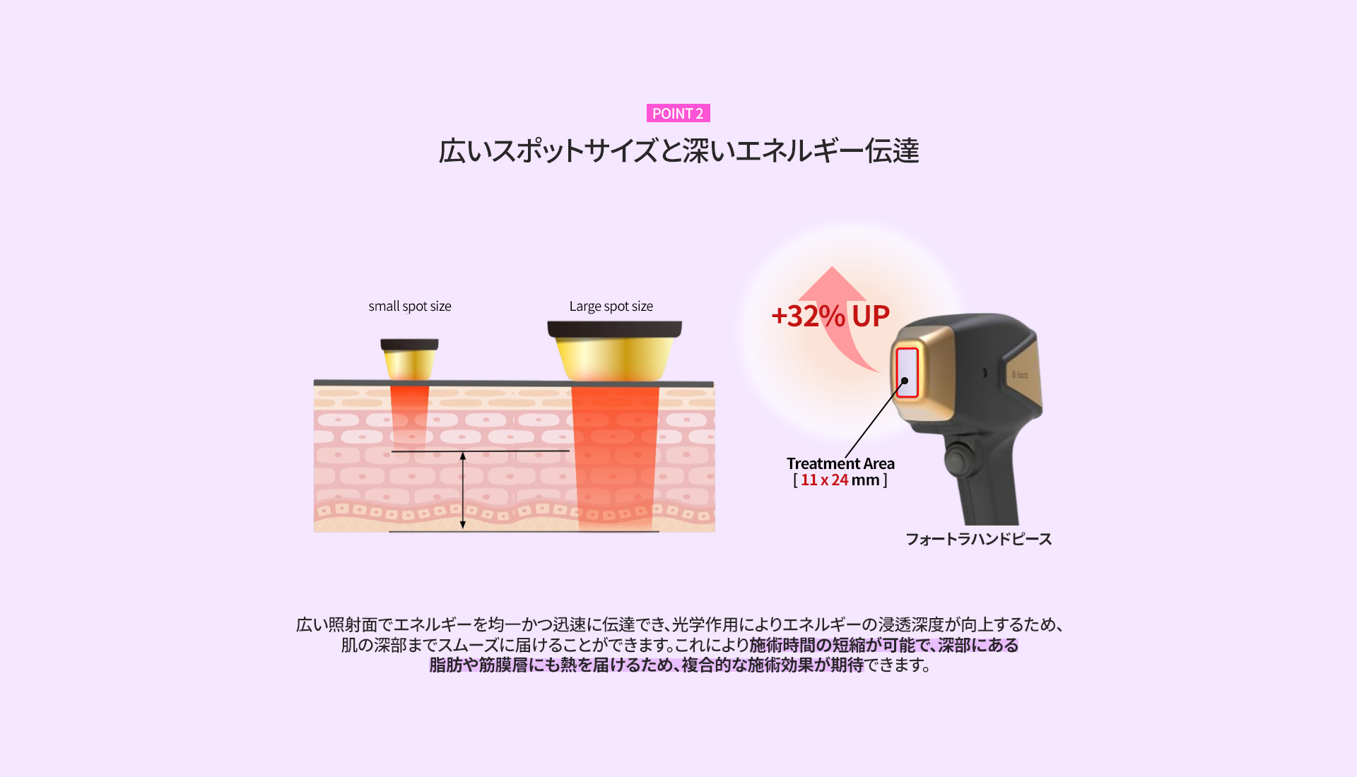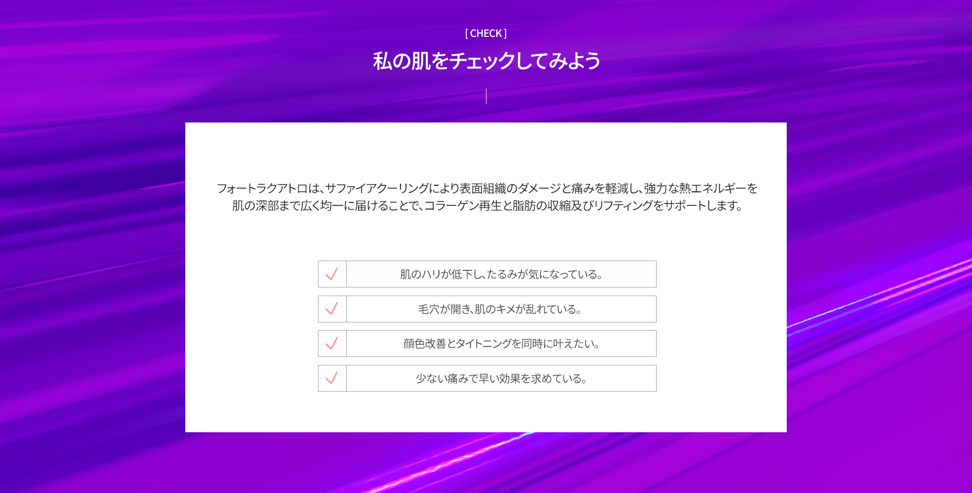 フォートラクアトロは、4つの波長のシナジー効果でコラーゲン再生を促し、肌のハリ強化とリフティングに効果が期待できます。